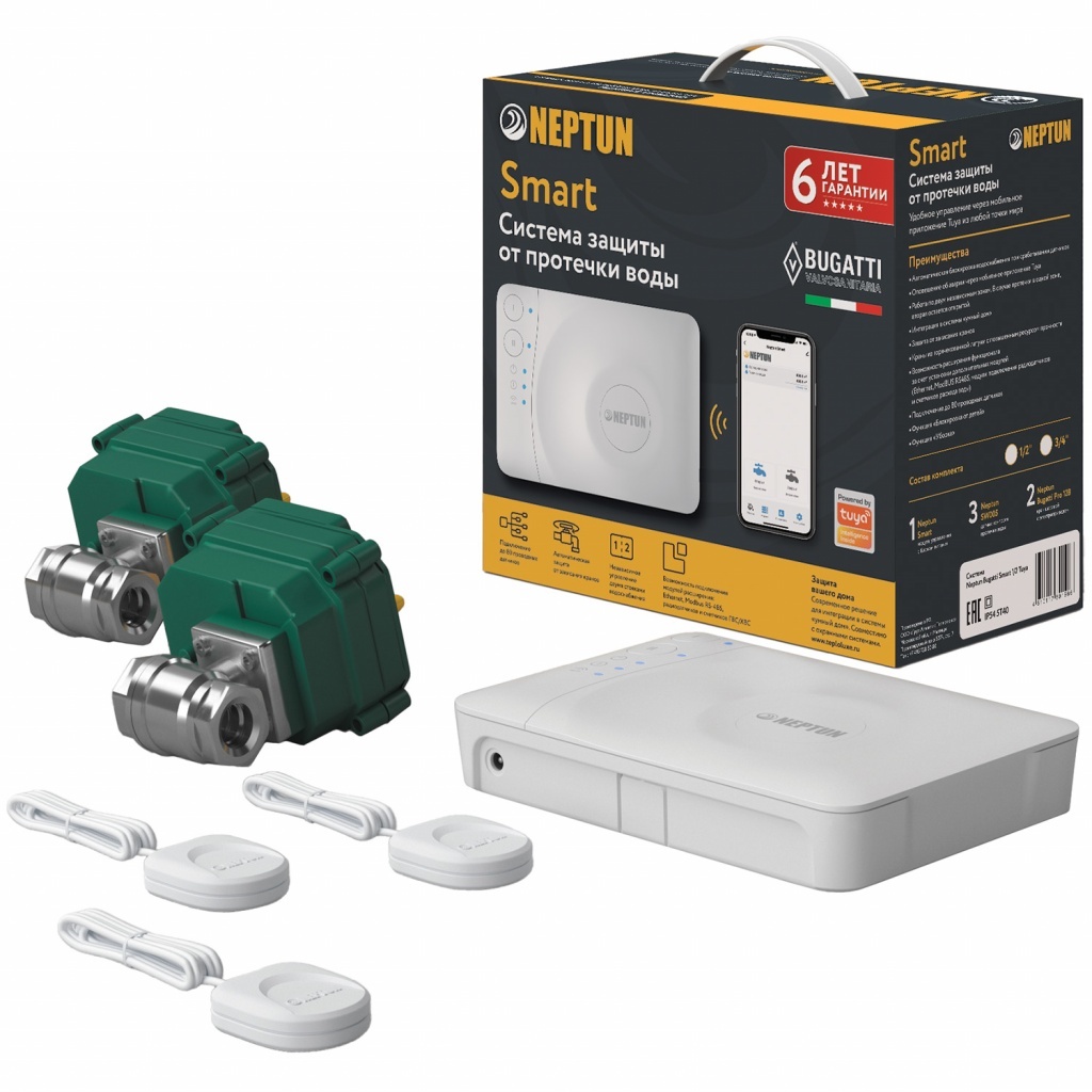 Умная система защиты от протечки воды Neptun BUGATTI Smart Tuya предназначена для обнаружения и локализации протечек воды в системах водоснабжения. Компоненты системы связаны и взаимодействуют друг с другом через центральный контроллер (модуль управления Neptun Smart), который может быть дополнительно укомплектован дополнительными платами расширения:• RS-485 (для систем диспетчеризации)