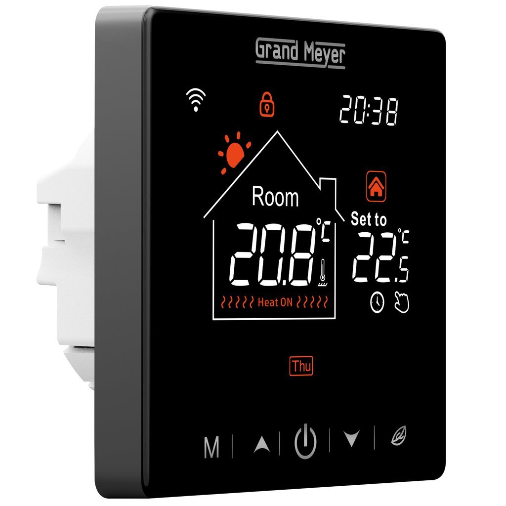 Grand Meyer SN series, Сенсорный программируемый терморегулятор с функцией удаленного доступа по сети Wi-Fi для управления теплым полом. Терморегулятор автоматически поддерживает заданную температуру обогреваемой поверхности по показаниям датчика температуры пола (входит в комплект поставки) или по показаниям датчика температуры окружающего воздуха (встроен в регулятор), или в комбинации обоих датчиков. Имеет функцию прогноза погоды. Регулятор приспособлен для скрытого (утопленного) монтажа в гнезде стандартной монтажной коробки.